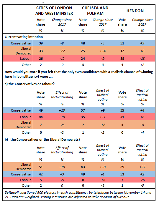 In the third seat, Chelsea and Fulham, the poll dents Lib Dems hopes that tactical voting could help Nicola Horlick, the financier and one of their high-profile candidates, overturn a Conservative majority of more than 8,000. She and Labour’s Matt Uberoi both lag more than 20 points behind Greg Hands, the former minister defending the seat for the Conservatives.