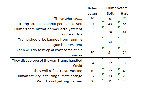 During the week of Joe Biden’s inauguration, YouGov conducted a detailed survey on American attitudes to the country’s leaders and main controversies . One of its most intriguing findings concerned Trump’s refusal to concede that he had lost November’s election. Those who had voted for him divided almost evenly: 44 per cent said he should concede; 56 per cent supported his refusal to do so. At my request, YouGov has analysed the responses of those two groups to all its questions. In the table below, which reports a selection, I have labelled the first group “soft” Trump voters and the second group “hard” Trump voters.