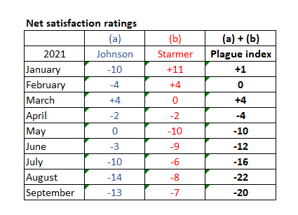 That changed as we headed through spring to the summer. Both leaders’ ratings fell: Starmer more abruptly, Johnson more gradually. For the past four months, both men have had negative scores and the Index has descended to around minus 20: well into plague territory.