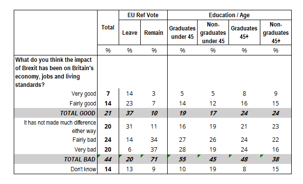 That view is supported by the figures for the broad age and educational categories – the main demographic influences on people’s views and votes. There is some difference between the “Jenny” group (graduates under 45) and the “Joe” group (non-graduates over 45), but in both, the number saying Brexit has been bad for Britain outnumber those saying it is good for Britain.