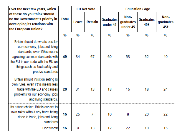 These figures indicate the advantages of framing the debate about Europe in terms of economic security rather than national identity. Among voters generally, agreeing common standards with the EU is supported by more people (49%) than the two more hardline pro-Brexit options combined (36%). More to the point, it is the preferred option of a large minority of Leave voters (34%) and non-graduates over 45 (40%). In short, it is a policy that many Joes could back. Only one in five voters – and just one-in-three Leave voters – are prepared to sacrifice prosperity in order to insist on Britain’s right to set its own rules. Given that the Government’s own Office for Budget Responsibility makes clear that Brexit in its current form carries sufficient economic costs, the pragmatic argument for common rules and standards is one that Labour can win.