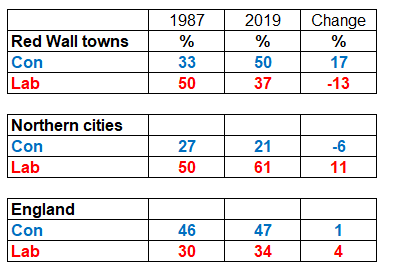 The impact of the trends represented by “Jenny” and “Joe” can be seen in the “Red Wall” towns captured by the Conservatives in 2019 – and in Labour’s growing dominance in the big cities in the same regions with established universities. The following table compares the way they voted in two general elections, 32 years apart, which both produced similar nationwide results – Conservative leads of 12 percentage points in the national vote.