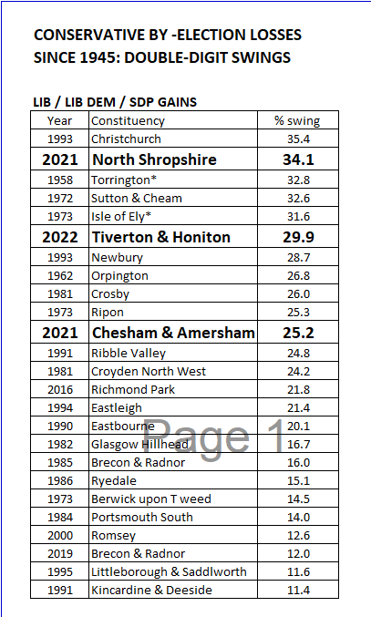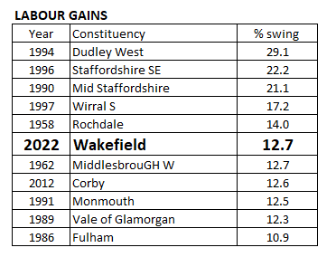 Meanwhile, where do these two results fit in the record books for Conservative by-election defeats? As it happens, both Wakefield and Tiverton & Honiton come sixth in the list of post-1945 gains for their respective winners. The swing to the Lib Dems in the South West, just under 30 per cent, was more than twice as big as the swing to Labour in the North – but Lib Dems often do secure massive by-election swings.