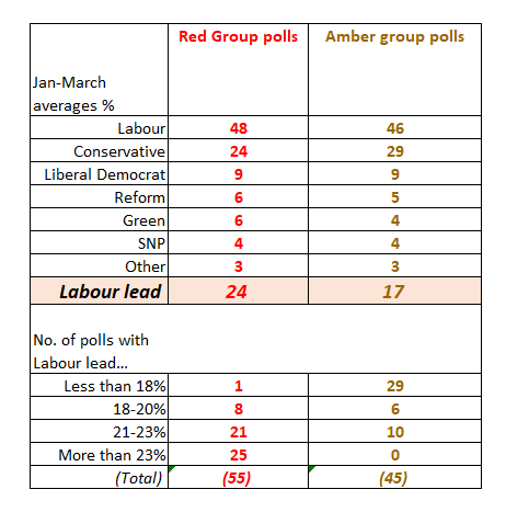 Today, however, polling methods vary from company to company. Instead of three or four working in much the same way, we have at least fourteen, and their results vary systematically. They can be divided into two groups, those that tend to report above average Labour leads, and those that tend to report below-average leads. Let’s call them red-group and amber-group polls. They are: