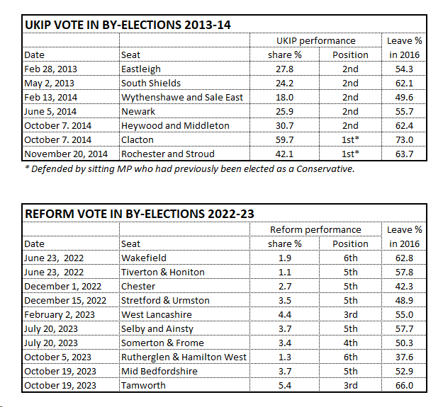 A secondary point is worth noting. There is a reasonably clear link between Ukip’s by-election vote in 2013-14 and local support for Brexit in the 2016 referendum. The more anti-EU the constituency, the better Ukip did. This pattern was repeated in the 2015 general election. Today, there is no more than the faintest hint of a Brexit effect on Reform’s record.