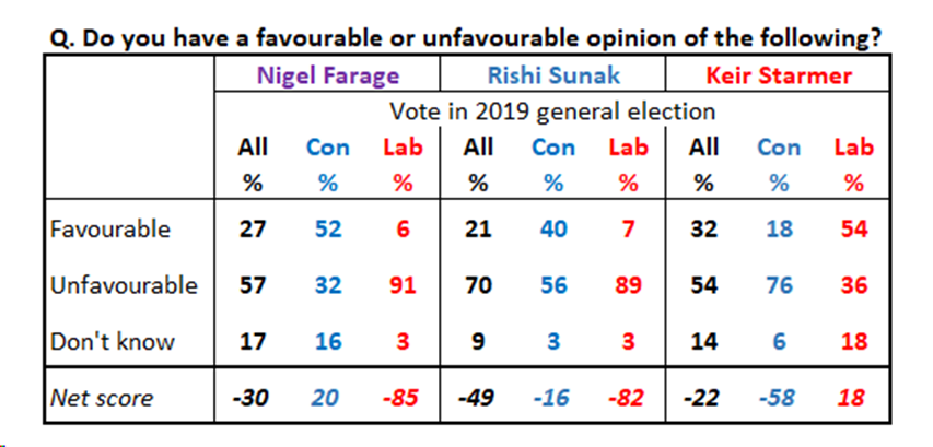 The figures for those who gave Boris Johnson his big victory four years ago are astonishing: a negative rating, minus 16, for Sunak among Tory voters, but a strongly positive rating of plus 20 for Farage.