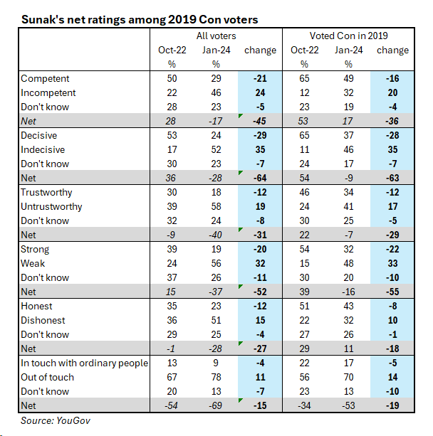 Let’s start with Sunak’s reputation. Poll after poll reports terrible satisfaction ratings. However, the views of the whole electorate, though interesting, are not the most important thing. Millions of voters would never vote Tory or think well of its leader. Sunak’s real test is his standing among those who voted Conservative at the last election. He needs to retain as much of their support as possible.