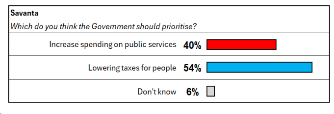 Secondly, the wording of the public services option makes a difference. The two Deltapoll questions listed specific services that millions of people rely on. Savanta just said “public services”. This of course includes police, prisons, defence, debt servicing, industrial policy, agricultural subsidies, road building, overseas aid and so on. Some things are more popular than others; and arguments about the efficiency of these services hover over them all.