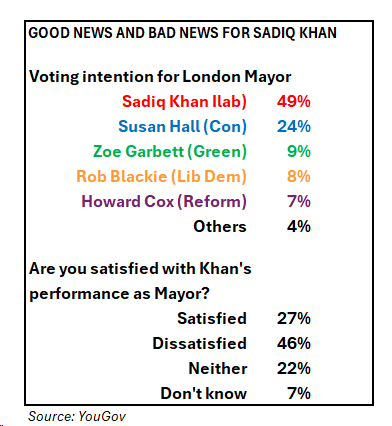 - Khan’s personal rating has slumped since he was re-elected three years ago. Last time more voters said he was doing well than badly. Now just 27 per cent tell YouGov they are satisfied with him, while 45 per cent say dissatisfied. Last year’s extension of ULEZ – the Ultra Low Emission Zone – to outer London did him no favours, as the Uxbridge by-election showed.
