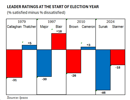 Governments have changed hands three times in the past half century. Unless something extraordinary happens, this year will see the fourth time when a defeated Prime Minister makes the unhappy post-election journey to Buckingham Palace to resign. But if we compare the ratings of the rival party leaders at the start of each of the four election years, we see that 2024 is unlike 1979, 1997 and 2010.