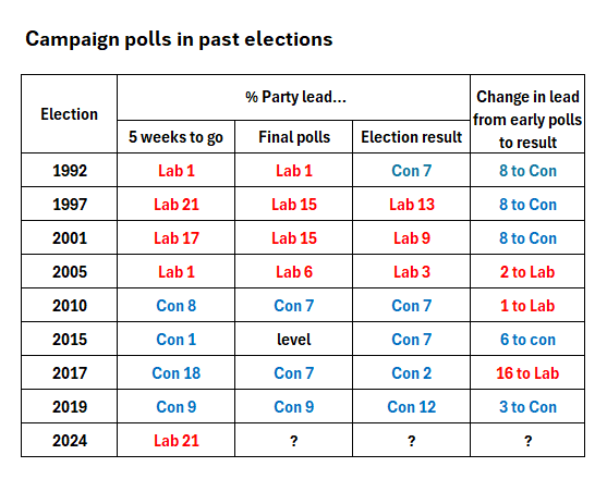 It’s possible that as election day draws near, “don’t knows” will climb off the fence, and the “pure” and “modelling” projections will converge. But if they don’t, I would expect the modelling approach to be nearer the result. If that is right, then Labour’s current, adjusted, lead is around 16-18 points. With the exception of 2017, no post-1945 election has seen movements that would wipe out that lead – however badly the polls performed.