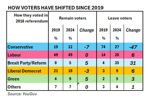 The shifts among Remain voters look like those in a normal general election: each party is up or down a few points. The biggest shift is an 7-point drop among Conservatives. (It’s worth noting that Labour’s support among Remain voters is the same as in 2019: 49 per cent. Labour’s increased overall support comes from Leave voters, and those who were too young to vote in the 2016 referendum.)