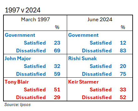 Every figure – for the outgoing governments and the party leaders – is far worse than 27 years ago. John Major and his government had bad ratings in 1997; Rishi Sunak and today’s Tories have an even worse reputation. Tony Blair had a net rating (satisfied minus dissatisfied) of plus 22; Keir Starmer’s rating is minus 19.
